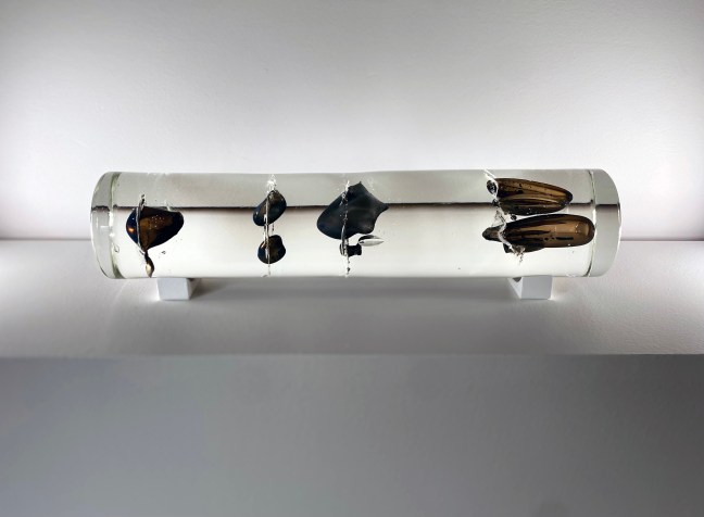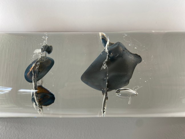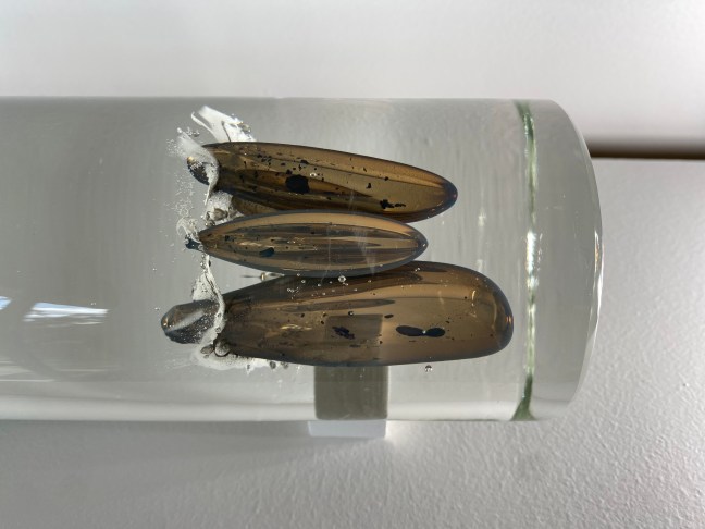 The work consists of glass-blown seeds which burn, blister and bubble, creating atmospheres of trapped air and microcosmic abstract forms of ash residue. The work depicts seeds frozen in time, referencing an ice core sample.