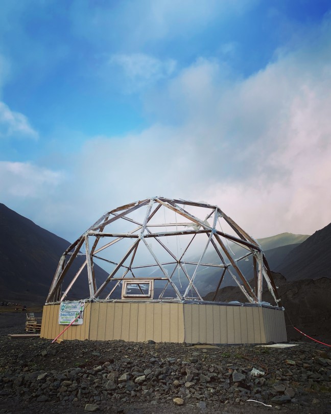 The glacial tongue of Longyearbyen Glacier peeks through the window frame of a decaying snow dome.